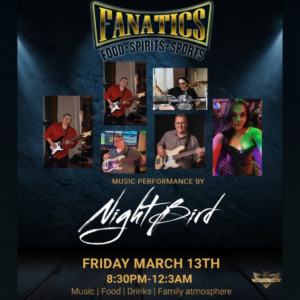 Nightbird is LIVE at Fanatics on Friday, March 13th from 8:30 PM–12:30 AM!