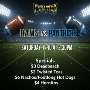 Catch the RAMS vs PANTHERS this Saturday 1/10 at 2:30pm at Fanatics!